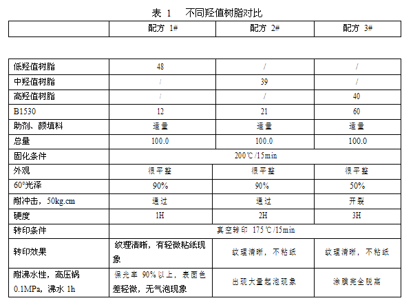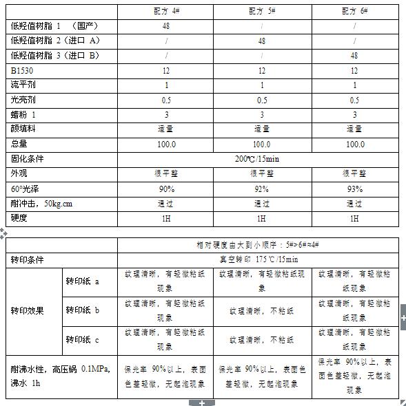本文中“高光”是指采用光澤儀的 60º 角測的光澤在 80%單位以上。 目前鋁型材熱轉印的方式主要是通過真空轉印方式,對于熱轉印粉末來說,首先必須保證其不粘紙,其次需要流平好、機械性能優良和耐沸水性能優異才能適合應用于鋁型材。聚氨酯木紋粉主要由羥基樹脂和封閉型多異氰酸酯組成, 而中國市場上封閉型多異氰酸酯主要以國外進口的德固賽公司生產的 B1530 為主,羥基樹脂國內外品種較多,大概分為三大類,即低羥值樹脂(一般羥值在 30mgKOH/g-50mgKOH/g 之間) 、中羥值樹脂(一般羥值在90mgKOH/g-110mgKOH/g之間) 和高羥值樹脂 (一般羥280mgKOH/g-320mgKOH/g之間) 。所以需要先研究不同羥值樹脂對涂膜的影響。
