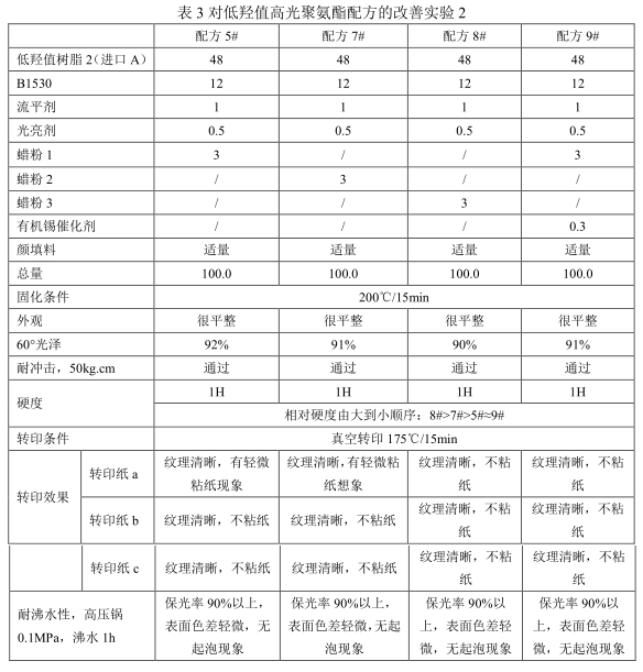 從表 1 知, 羥基樹脂的羥值大小對涂膜的影響非常大, 整體上聚氨酯粉末的流平性都很好,但是隨著羥值的增大,其機械性能越來越差,硬度越來越高,轉印效果逐漸變好,耐沸水性隨之變差。對比配方 2#和 3#發現,中羥值樹脂的交聯密度和硬度已經基本上能保證熱轉印效果良好,而且高羥值樹脂還具有機械性能太差、光澤較低和耐沸水性極差等特點,所以制備高光聚氨酯木紋粉末就不考慮高羥值樹脂。這樣對于配方 1#來說,只要解決其轉印效果不太好的問題,就能設計出來高光木紋粉末涂料。對于配方 2#來說,也只要解決其耐沸水性能不好的問題就能制備出高光木紋粉末。對于配方 1#,我們可以通過篩選不同廠家的低羥值樹脂來看涂膜效果是否有差異,也可以考慮添加增硬蠟粉來改善, 或是加入有機錫類促進劑來提高固化程度。 其探索實驗如表2 和表 3。