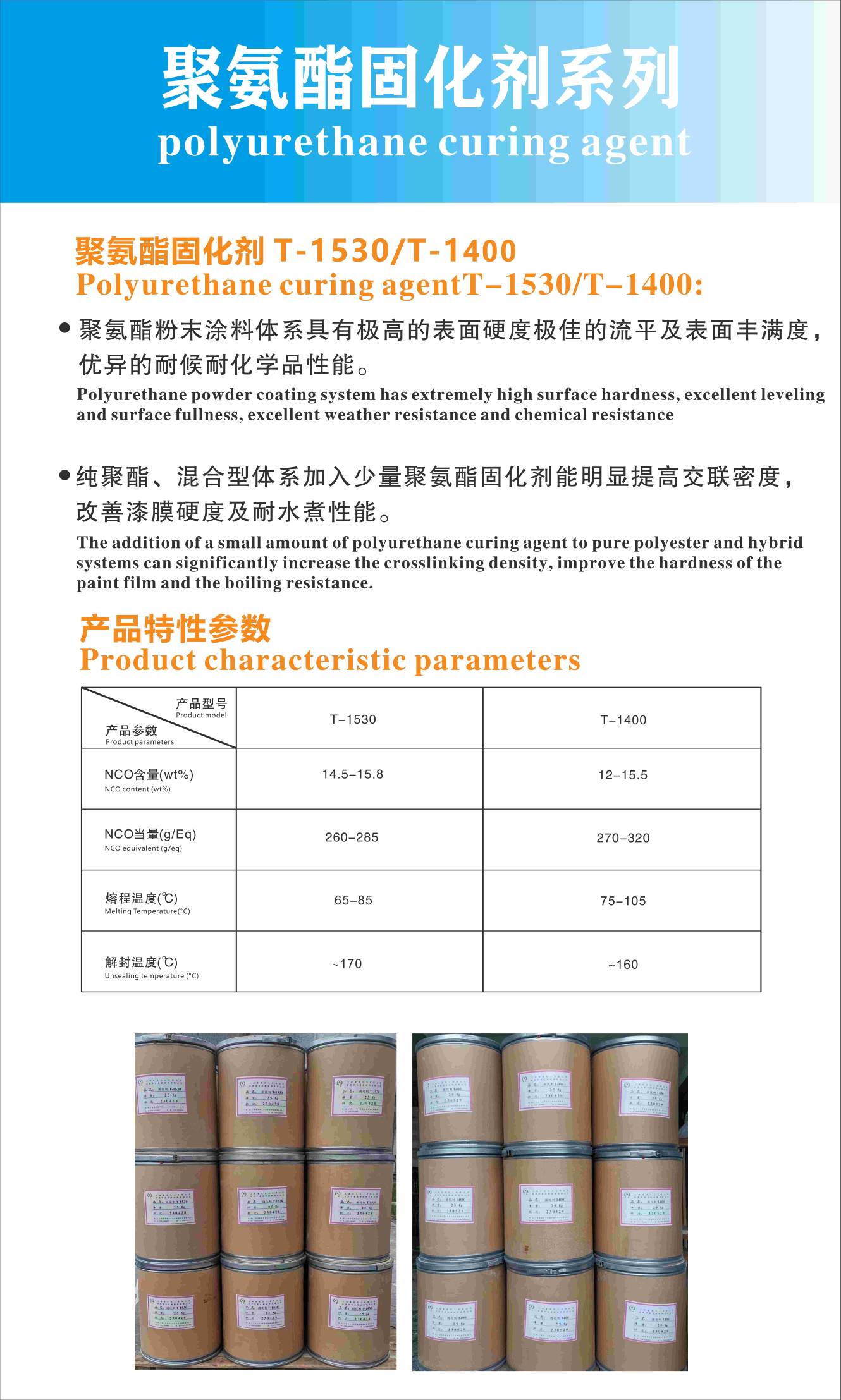 其中,索是化工的固化劑T-1530是一種用于與含羥基性樹脂酯合的多異氰酸酯加合物。可與各種含端羥基的聚酯樹脂和丙烯酸樹酯配合,用于制造具有優異物理性能的耐候型裝飾性粉末涂料。所用的多元醇對于涂料的性能具有決定性的影響。